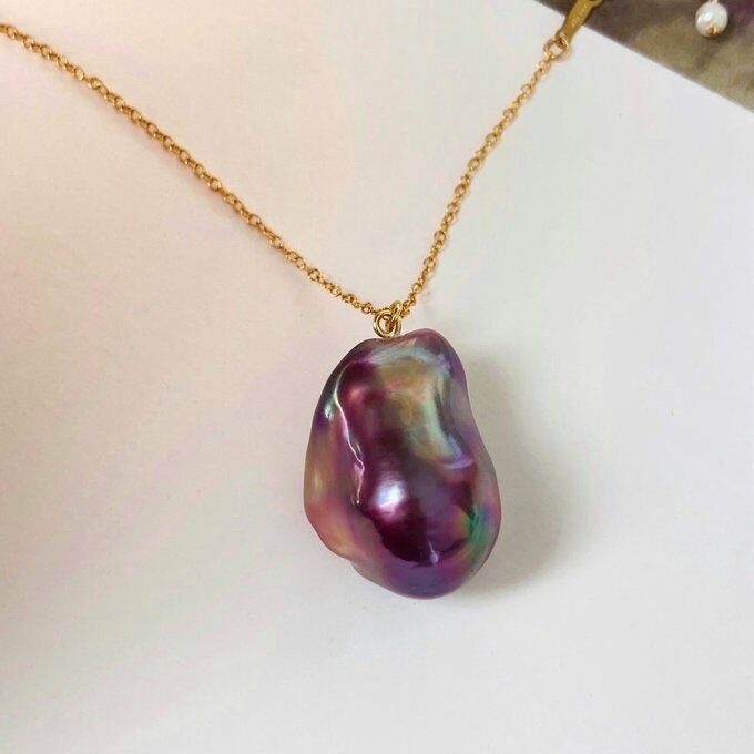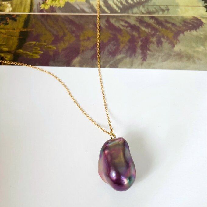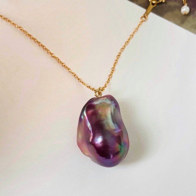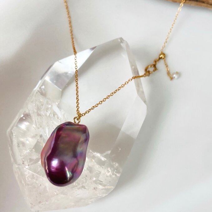 【一点もの】無穴 14kgf 調整可能ボールチェーン パープル系バロックパールロングネックレス オイスターパール