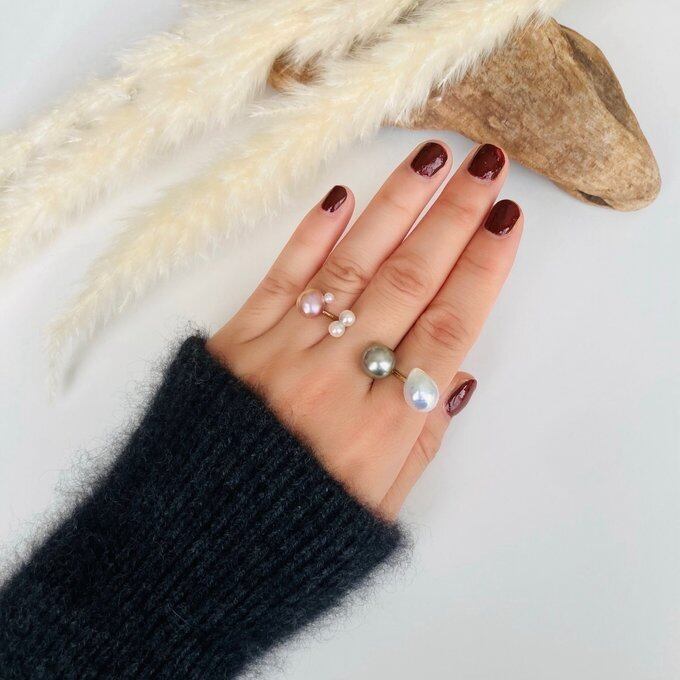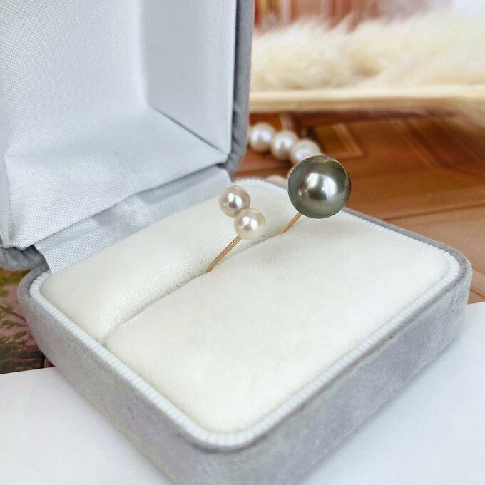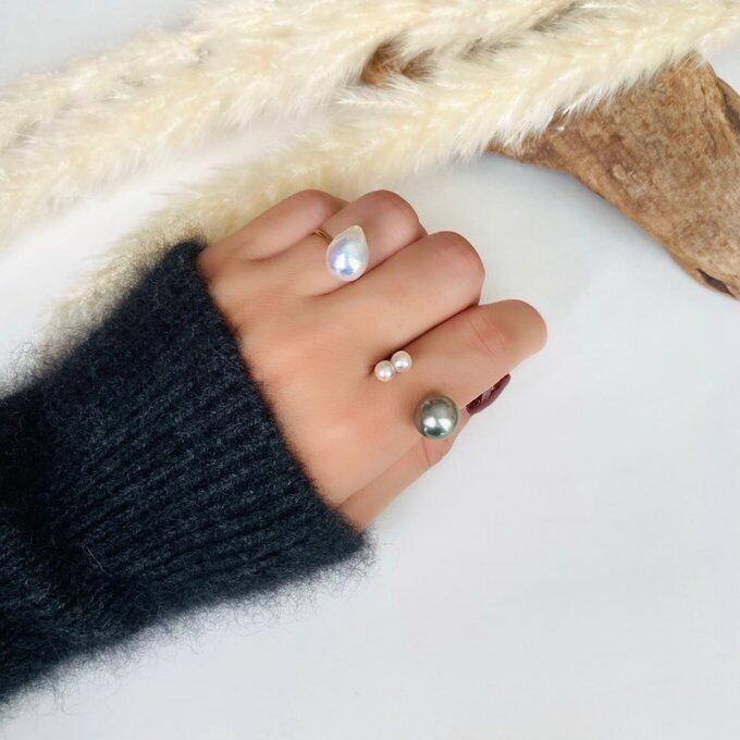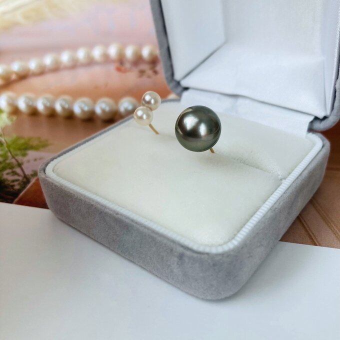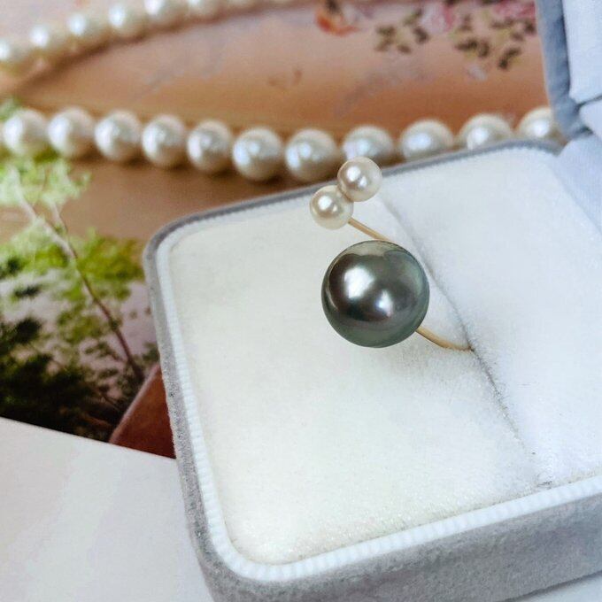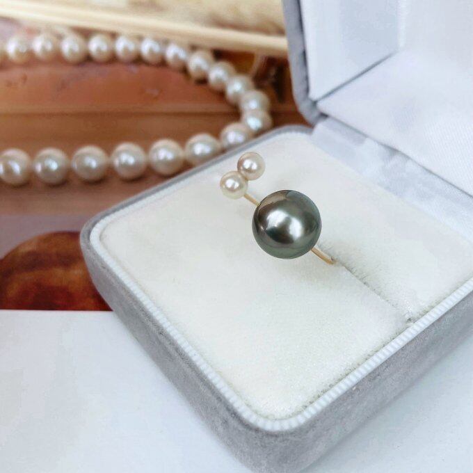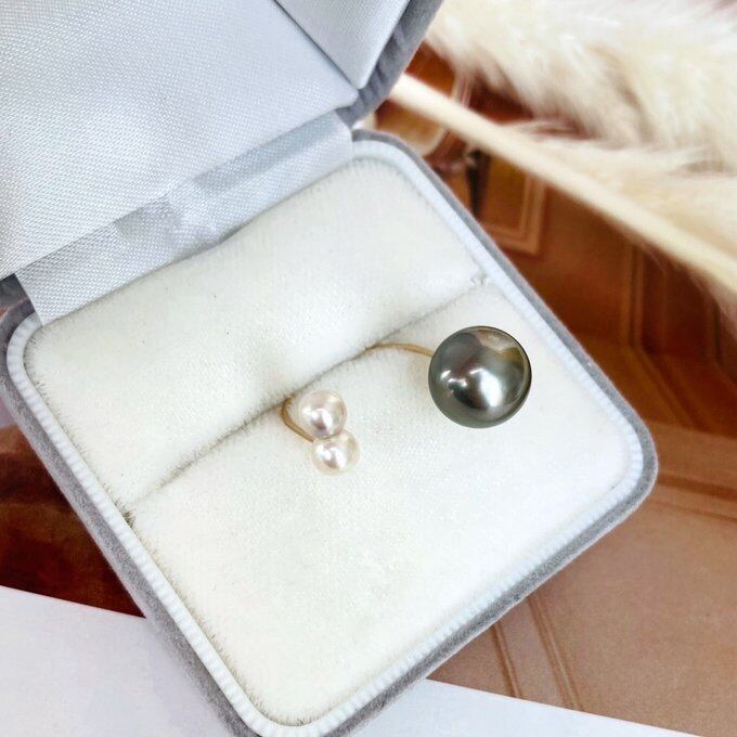 大粒の黒蝶真珠と今は希少となった双子のあこや真珠を使ったかなり贅沢なダブルパールのリング。