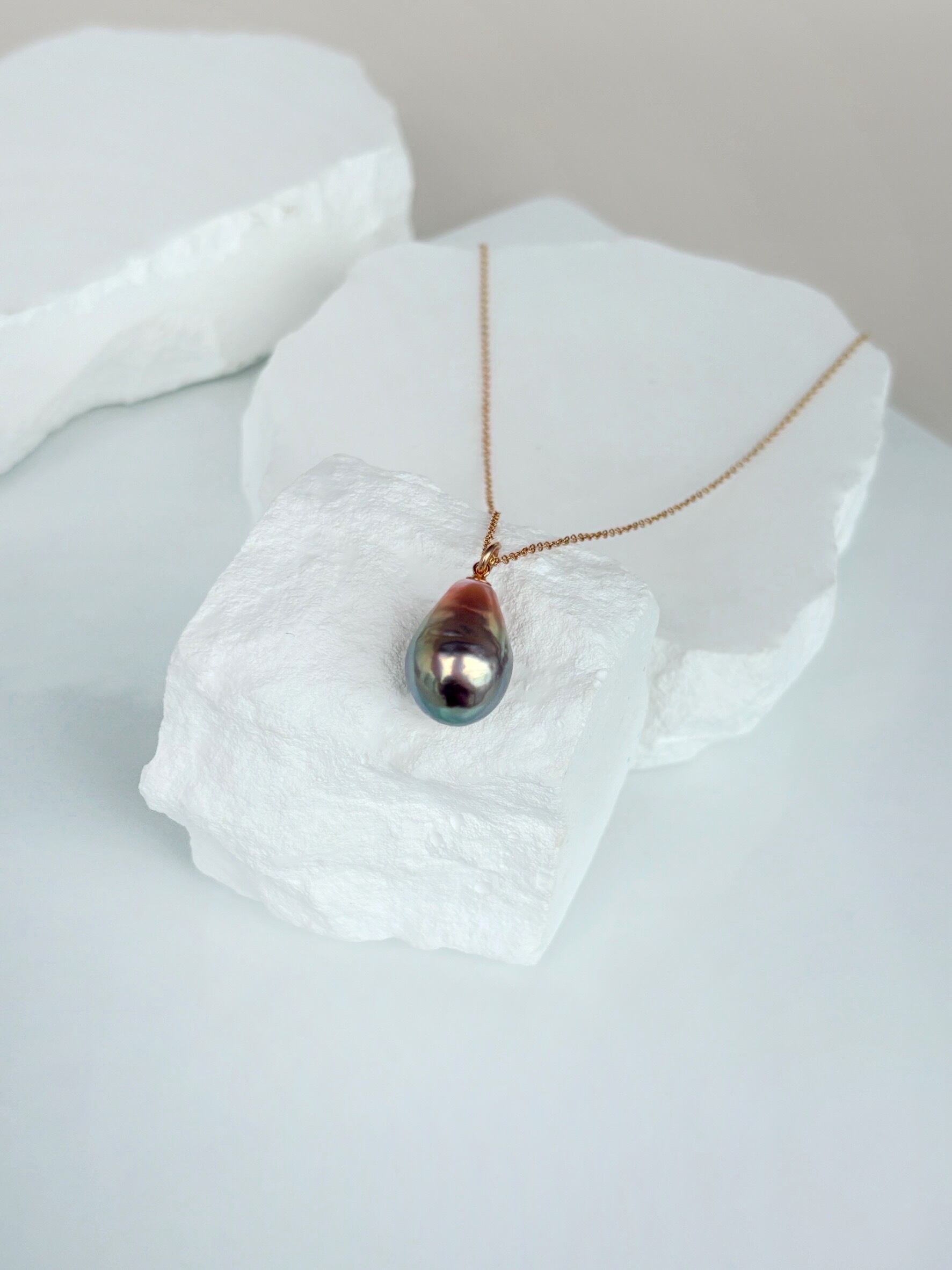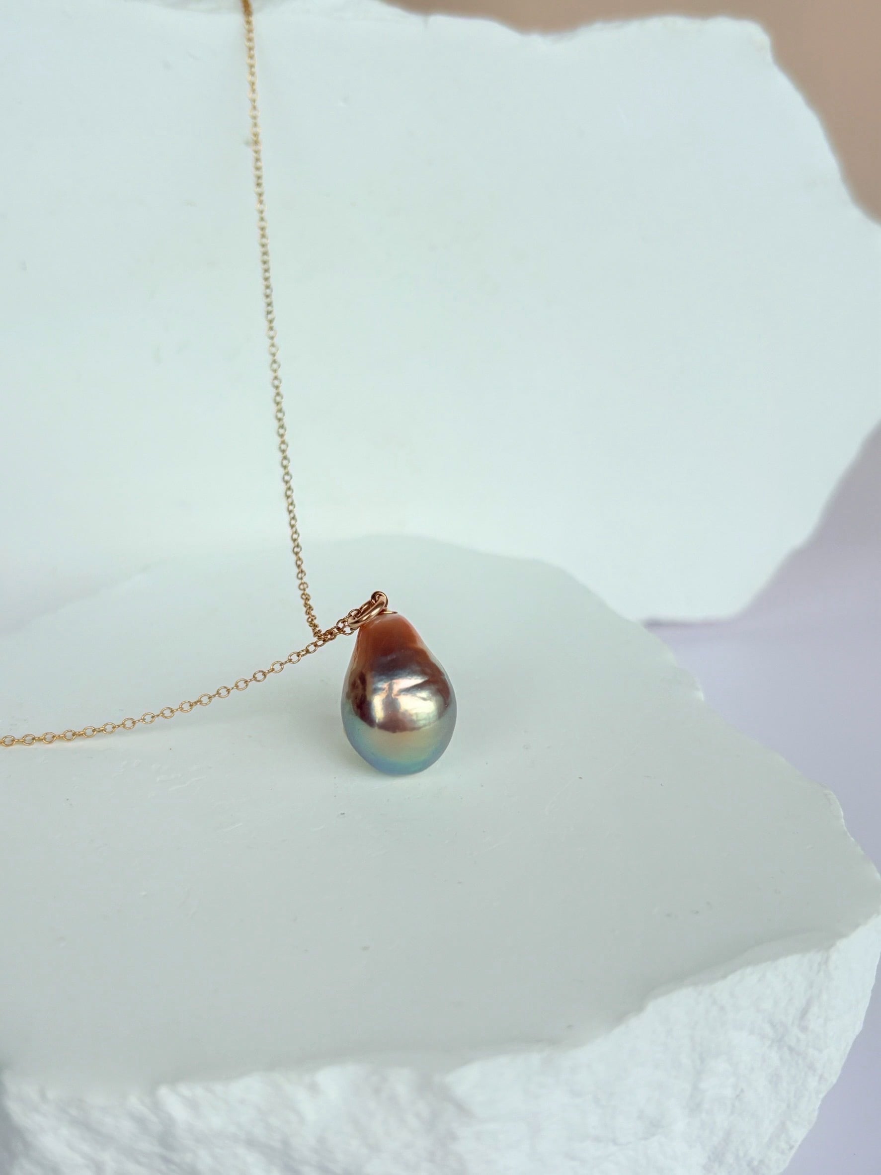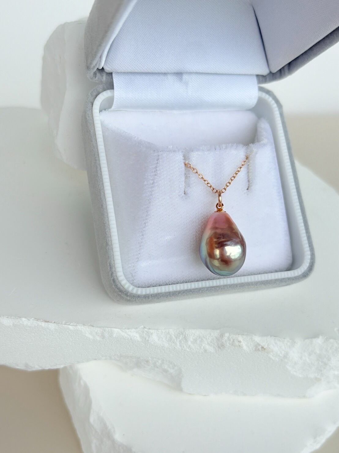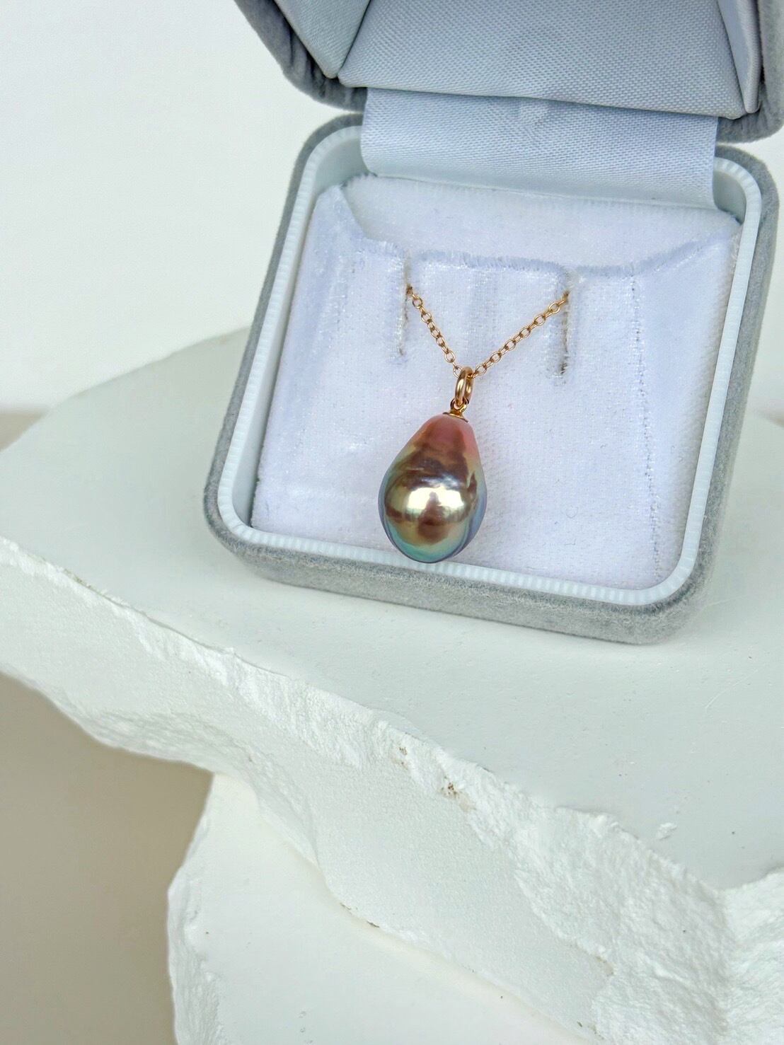 グリーン等色んな色味が出る希少なバロックパールをネックレスに。