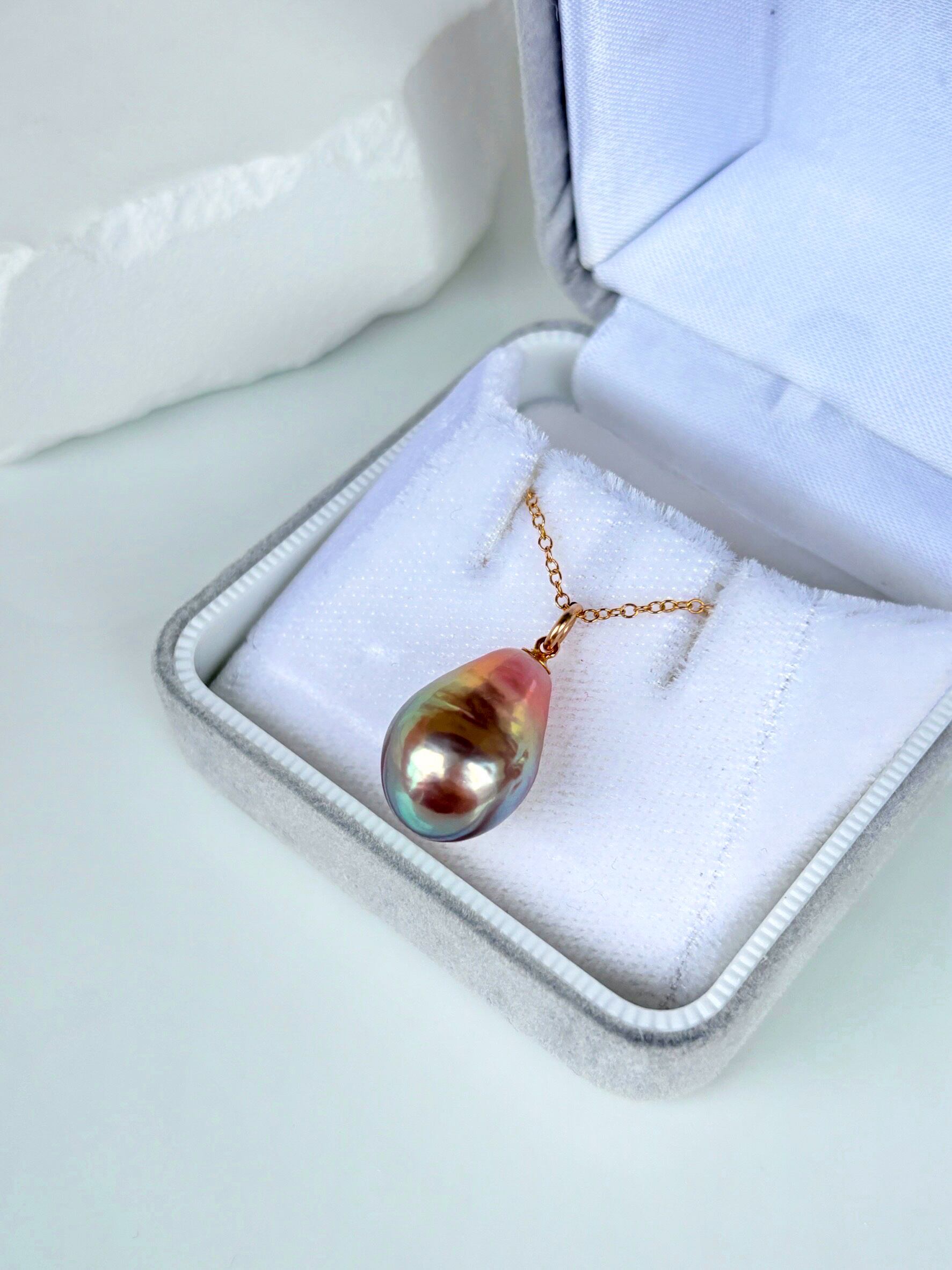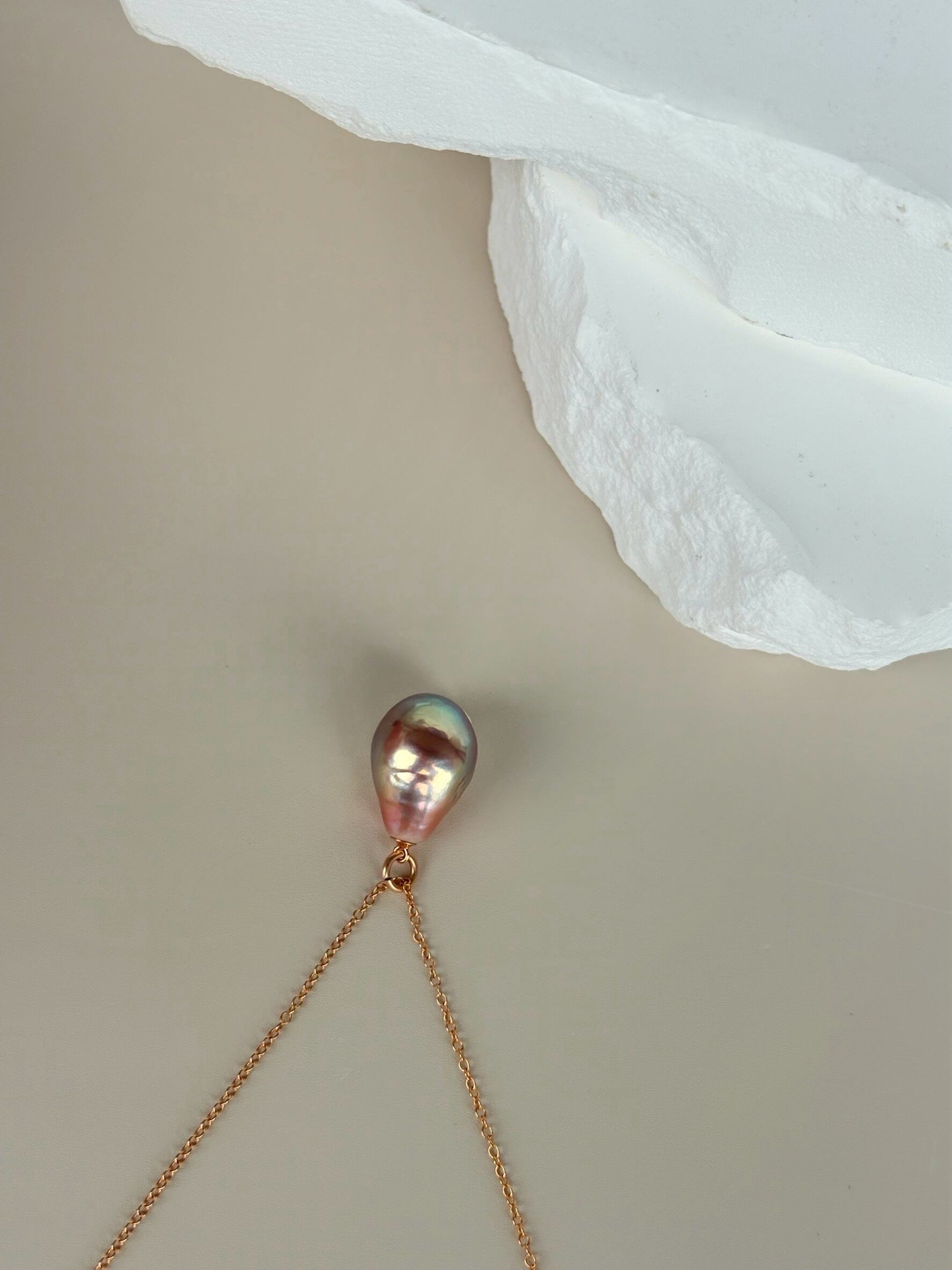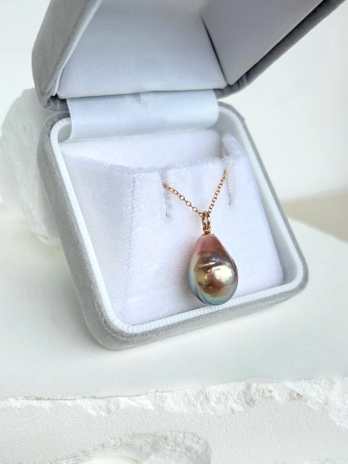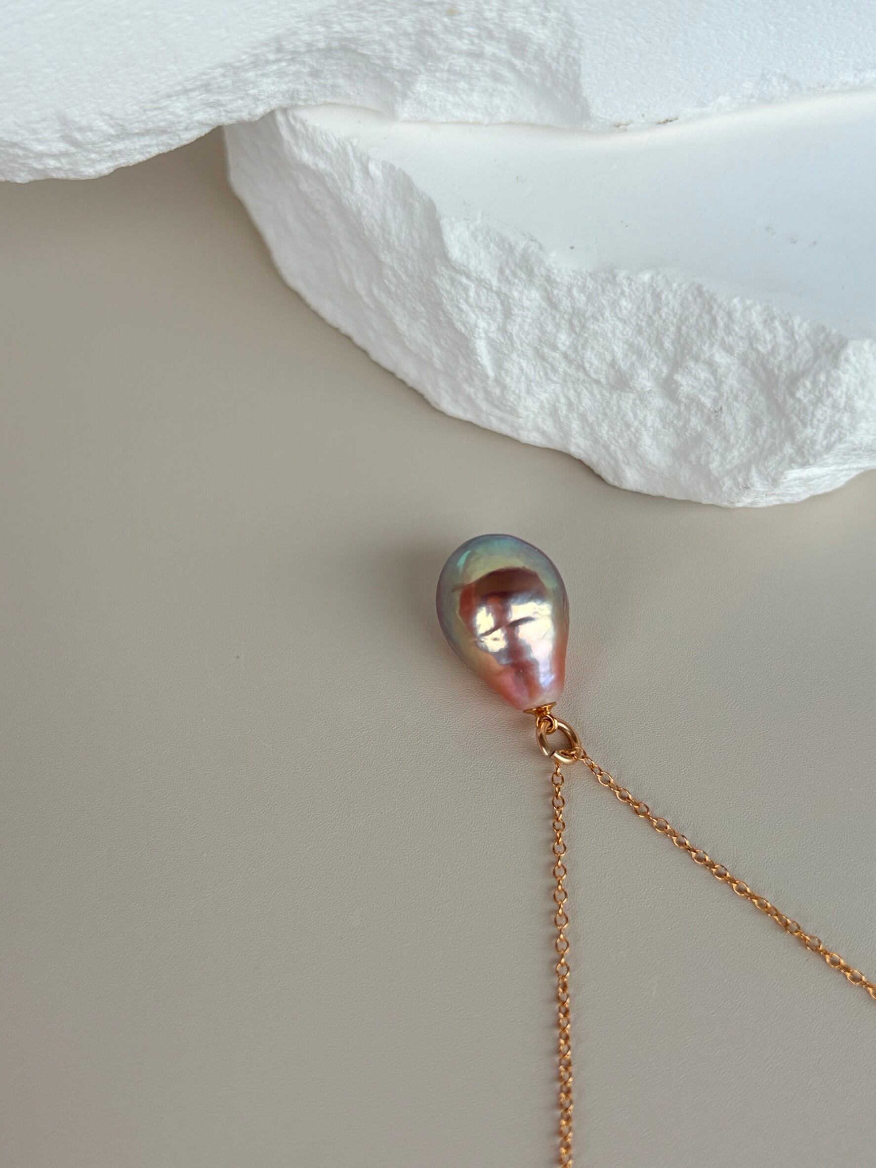 グリーン等色んな色味が出る希少なバロックパールをネックレスに。