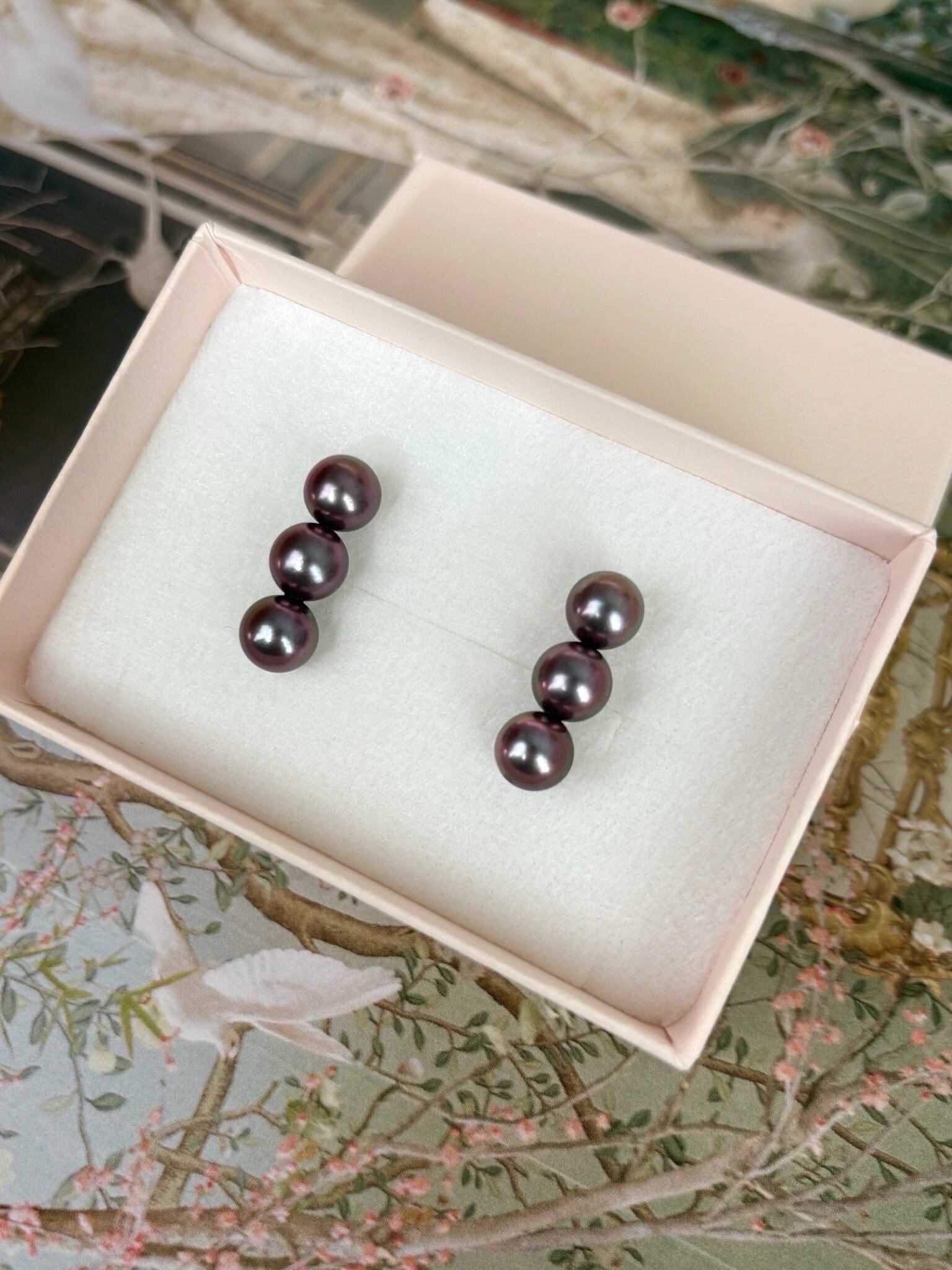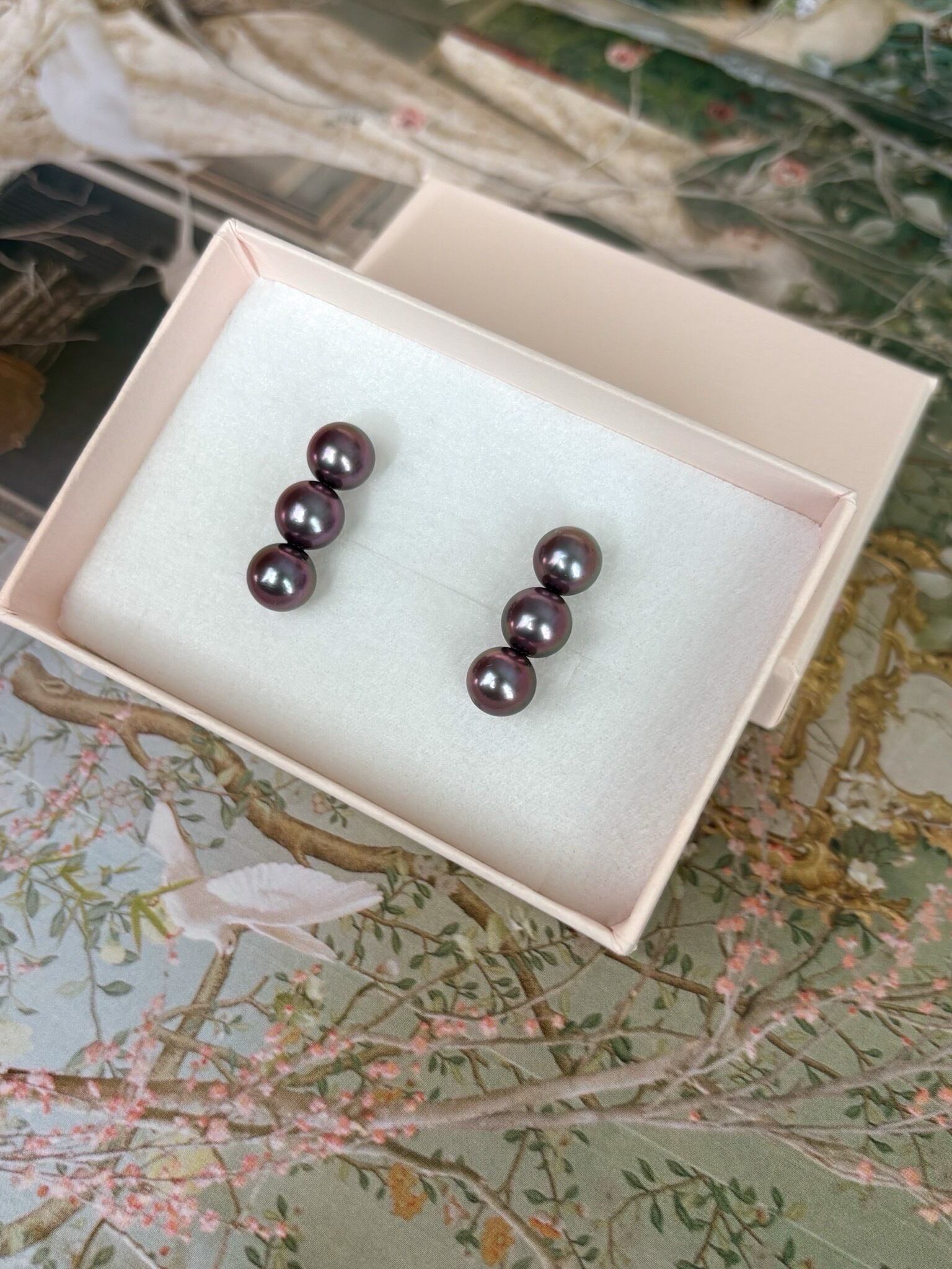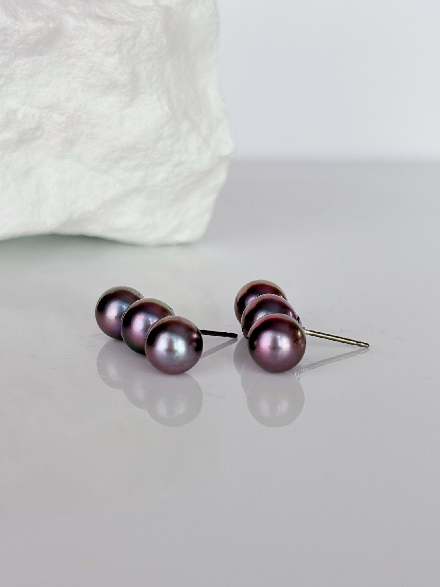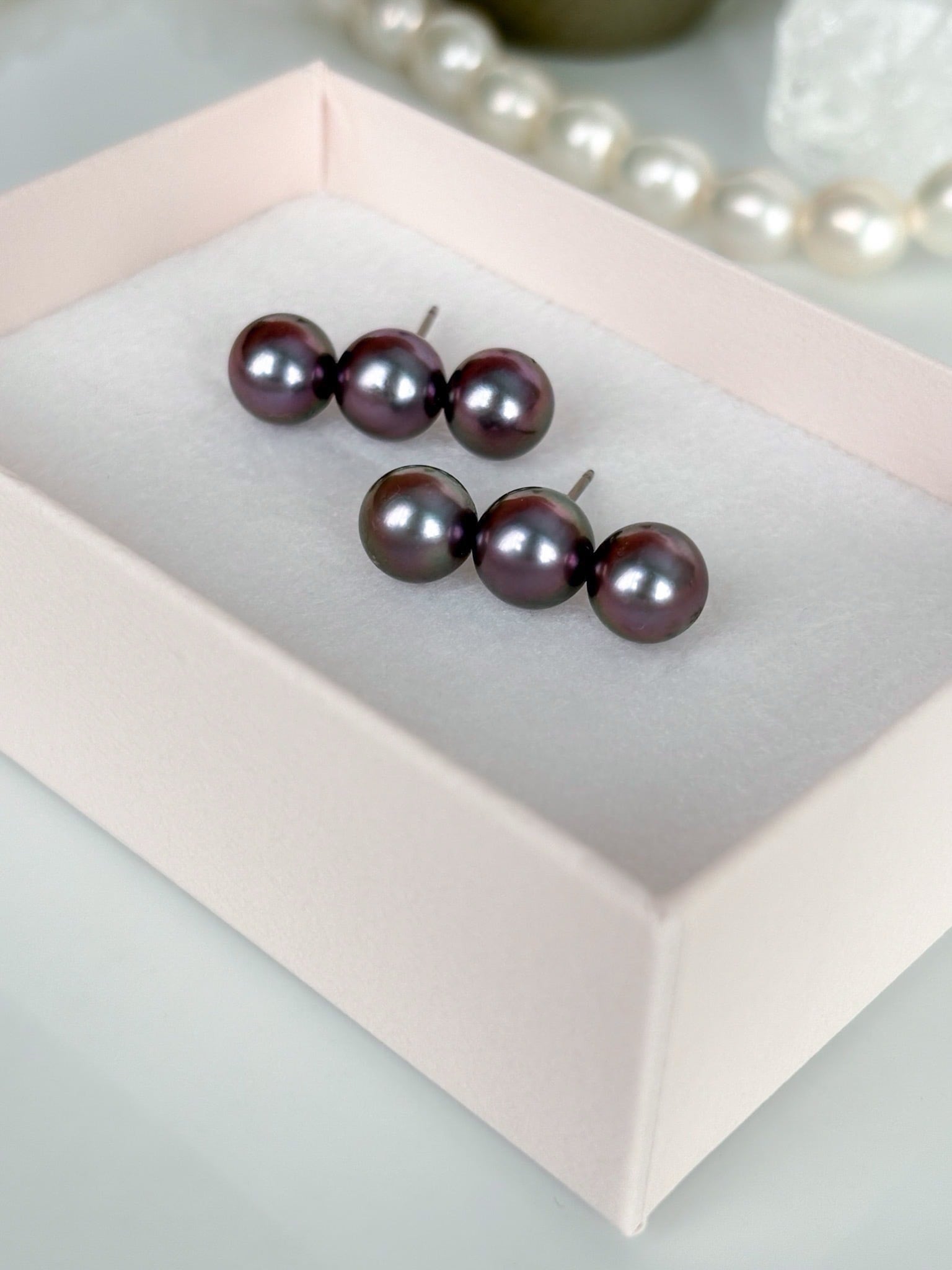 【数点のみ】高品質 アコヤ真珠濃いパープル 3粒パールのピアス